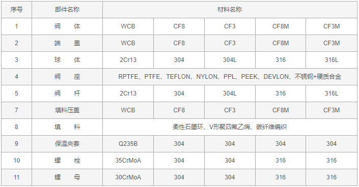 不銹鋼夾套保溫球閥零件材料: