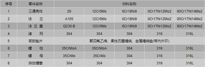 T型側(cè)流式過濾器零件材料: