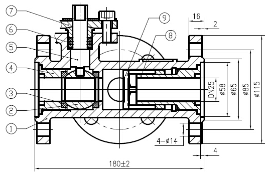 組合式三通球閥由于在高壓和低壓通道內(nèi)分別設(shè)置了球閥和止回閥密封副,通過閥桿旋轉(zhuǎn)球體將高壓通道的球閥密封副打開,高壓通道與中通通道連通,高壓介質(zhì)得以流過閥門,同時低壓通道內(nèi)的止回閥瓣在高低壓介質(zhì)的壓差作用下將低壓通道關(guān)閉,由此使得高壓通道處于開啟狀態(tài)而低壓通道處于關(guān)閉狀態(tài),經(jīng)閥桿帶動球體旋轉(zhuǎn)將高壓通道的球閥密封關(guān)閉,高壓介質(zhì)不能流過閥門,同時低壓通道內(nèi)的止回閥瓣在低壓介質(zhì)的壓力下脫離低壓閥座,使低壓介質(zhì)得以流過閥門,由此使得高壓通道處于關(guān)閉狀態(tài)而低壓通道處于開啟狀態(tài),實現(xiàn)了三通閥的目的。該閥由于將中間腔體的三通球體變?yōu)楦邏和ǖ赖亩ㄇ蝮w,并通過高壓通道的開啟和關(guān)閉控制低壓通道的關(guān)閉與開啟,當高壓通道關(guān)閉時,高壓介質(zhì)將球體壓向閥座,壓力越大球體和該閥座之間的密封力就越大,由此避免了高壓介質(zhì)通過球閥密封副向中通通道的泄漏。本產(chǎn)品的結(jié)構(gòu)長度與傳統(tǒng)的L型三通球閥相同。