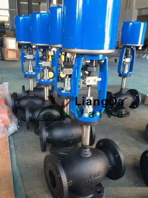 電動三通閥配以電子驅動控制裝置后,能調節(jié)蒸汽或冷、熱水的流量,廣泛應用于中央空調、采暖、水處理、工業(yè)的流體控制。驅動器是由可逆同步馬達驅動,并帶磁性離合器。馬達通過馬達轉子與離合器所產生的磁性作用,能在停頓的情況下產生穩(wěn)定的扭矩。故此當馬達沒有電流通過時能穩(wěn)定地停頓在任何一點,當閥門全開或全關時磁離合器分離,停止調節(jié)。驅動器的遞增式或比例式控制器所發(fā)訊號能使馬達順時轉動或逆時轉動。電動三通閥產品實物圖: