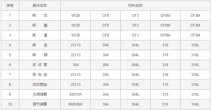 波紋管式減壓閥零件材料: