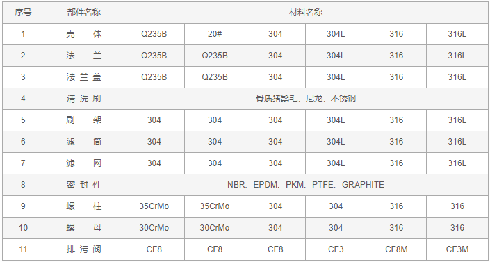 Y型全自動清洗過濾器零件材料表: