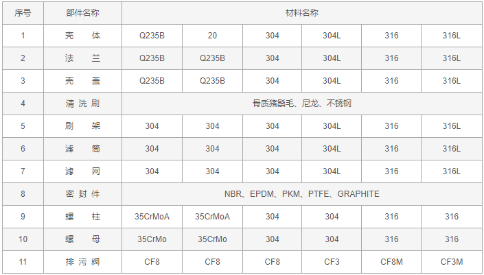F型全自動清洗過濾器零件材料表: