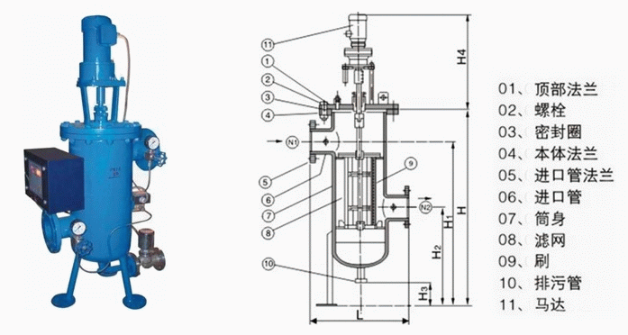 立式全自動(dòng)清洗過(guò)濾器外形結(jié)構(gòu)圖: