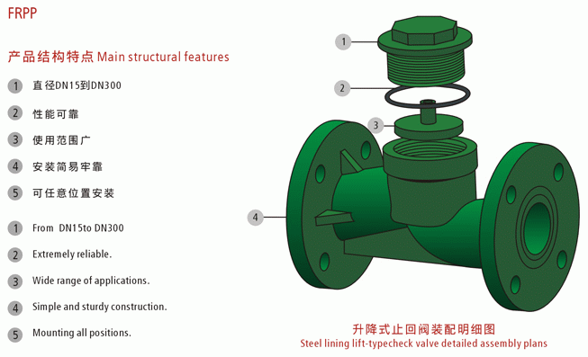 升降式塑料止回閥是指依靠介質(zhì)本身流動而自動開、閉閥瓣,用來防止介質(zhì)倒流的閥門,又稱逆止閥、單向閥、逆流閥、和背壓閥。止回閥屬于一種自動閥門,其主要作用是防止介質(zhì)倒流、防止泵及驅(qū)動電動機反轉(zhuǎn),以及容器介質(zhì)的泄放。止回閥還可用于給其中的壓力可能升至超過系統(tǒng)壓的輔助系統(tǒng)提供補給的管路上。止回閥主要可分為旋啟式止回閥(依重心旋轉(zhuǎn))與升降式止回閥(沿軸線移動)。止回閥的作用是只允許介質(zhì)向一個方向流動,而且阻止反向流動。通常這種閥門是自動工作的,在一個方向流動的流體壓力作用下,閥瓣打開;流體反方向流動時,由流體壓力和閥瓣的自重合閥瓣作用于閥座,從而切斷流動。 其中內(nèi)螺紋止回閥,蝶式止回閥就屬于這種類型的閥門,升降式塑料止回閥裝配明細圖: