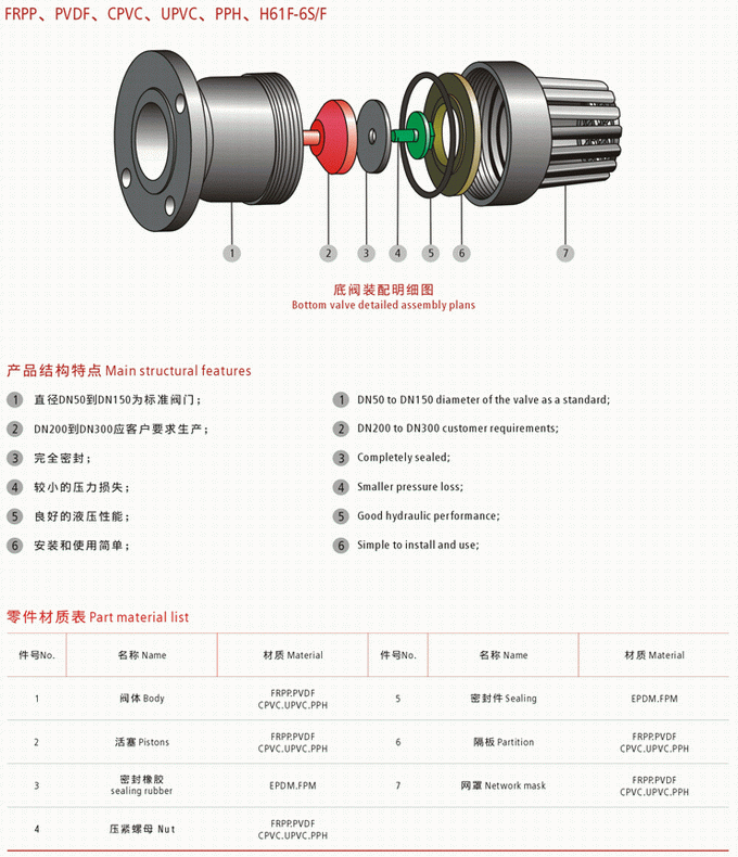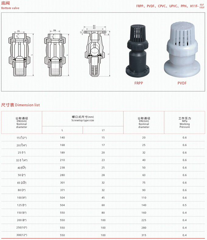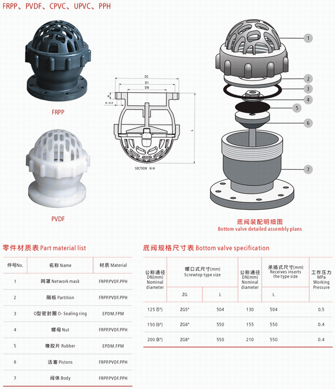 塑料底閥是一種節(jié)約能源的閥,一般安裝在水泵水下吸管的底端,限制水泵管內(nèi)液體返回水源,起著只進(jìn)不出的功能。閥蓋上有很多個(gè)進(jìn)水口和加強(qiáng)筋,起到了不易堵塞,主要應(yīng)用在抽水的管路上。水道和支承的作用.口徑有單瓣、雙瓣、多瓣型,有法蘭連接和螺紋連接。塑料底閥由閥體、閥蓋、閥瓣、密封圈和墊片等部件組成。底閥在接入管路后,液體介質(zhì)從閥蓋方向進(jìn)入閥體,液體的壓力作用于閥瓣,使得閥瓣被打開允許介質(zhì)流過(guò),當(dāng)閥體內(nèi)的介質(zhì)壓力變化或消失時(shí),閥瓣關(guān)閉阻止介質(zhì)倒流。塑料底閥零件材質(zhì)表: