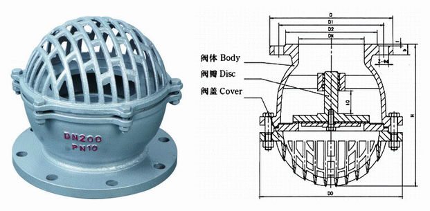 水下式底閥由閥體,閥瓣,閥蓋,襯套,密封圈等零件組成,詳見下圖水源的水從閥蓋進入閥體。在流體的壓力作用下,閥瓣打開水,當示停后出口管內(nèi)的壓力將閥瓣迅速關閉,液體將不會倒回水源,起到了即暢通抽水又節(jié)約水能損失的作用。