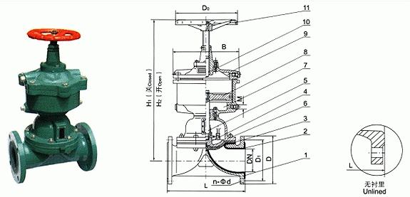 1、閥體 2、閥體襯里 3、隔膜 4、閥瓣 5、下閥桿 6、閥蓋 7、氣缸 8、活塞 9、氣缸蓋 10、上閥桿 11、手輪
