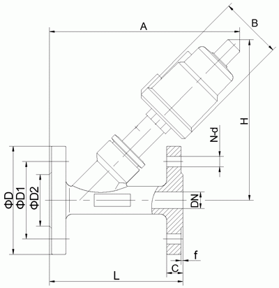 全不銹鋼法蘭氣動角座閥外形結(jié)構(gòu)圖: