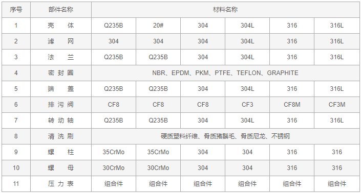 手搖刷式過濾器零件材料: