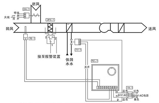 4、當盤管后的溫度低于某限值時,低溫保護開關(guān)TS-1切斷送電機的電源,從而使 新風風閥關(guān)閉,防止盤管內(nèi)的水結(jié)冰,漲裂盤管。