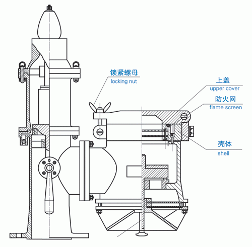 當貨油艙的透氣系統(tǒng)裝設了符合規(guī)定的高速透氣閥后,艙內(nèi)的驅(qū)氣,只要艙內(nèi)壓力達到高速透氣閥的設定開啟壓力,壓力閥就會自動開啟,以大于30m/s的速度向甲板上空排出。但貨油艙的其他作業(yè)工況,比如清洗、除氣,也需要透氣,或隨時需要將艙內(nèi)和大氣連在一起時,此時艙內(nèi)壓力或無壓而不能打開壓力閥(注:壓力閥是不能在手動打開,而出口流速不小于30m/s的情況下工作的),就需要一個能手動開啟的透氣裝置,該裝置即為驅(qū)氣蓋。依據(jù)MSC/Circ.677中的相關要求,驅(qū)氣蓋并具有壓力/真空閥的等同要求,應能阻止火焰進入貨油艙。因此,配有驅(qū)氣蓋的高速透氣閥,不管是壓力閥還是真空閥出現(xiàn)故障時,只要打開驅(qū)氣蓋進行透氣。