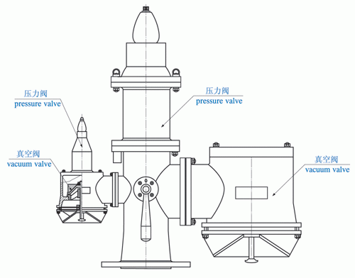 依據(jù)IMO和IBC規(guī)范,每只貨油艙需設兩套透氣裝置或一套透氣裝置加一套液貨壓力傳感器,以防止其中之一出現(xiàn)故障時也能確保艙內(nèi)不超壓或失壓。因此,經(jīng)認可的各規(guī)格高速透氣閥,也可以將其中一個規(guī)格作為附件與主流量閥組合在一起。壓力設定成主流閥為正常工作壓力,附件閥為保險壓力。這樣的透氣方式既可最大限度地防止貨油艙超壓或失壓。同時,在裝載速率允許的情況下,也可以作為增大裝載速率的補助裝置,但這種透氣裝置成本較高。