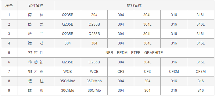 全自動(dòng)反沖洗過濾器零件材料表: