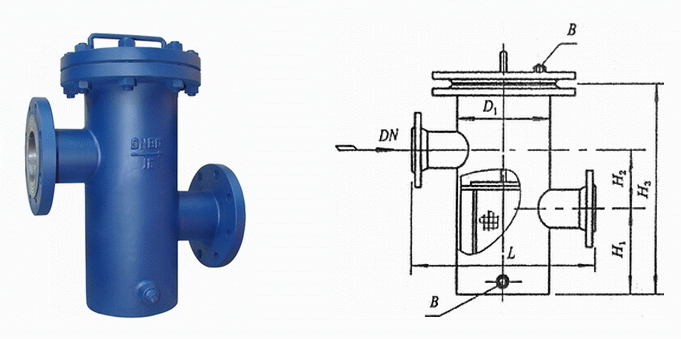 高低籃式過濾器是一種由中部筒體、底板、濾籃、高低接管、法蘭、盲板、墊片及螺柱螺母等組成,用以阻擋不同粒徑固體雜質(zhì)的裝置,其通過焊接工藝先將接管的一端分別焊裝在筒體左右兩側(cè)不同水平高度上,再將進出口連接法蘭焊接在接管的另一端,以方便與設(shè)備或管道相連,而濾籃則活動安裝在筒體內(nèi)部,從而將進出口隔開以達到過濾的目的。本產(chǎn)品殼體材料有碳鋼、低合金鋼和不銹鋼等,用戶可根據(jù)工況條件選定。