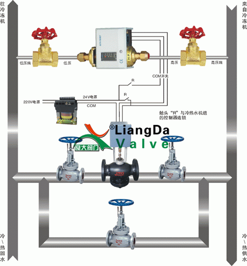 本系統(tǒng)適用于中央空調(diào)的冷凍水/熱水系統(tǒng)的壓差旁通控制用途。電動(dòng)壓差旁通閥的作用主要在于,維持冷凍水/熱水系統(tǒng)能夠在末端負(fù)荷較低的情況下,保證冷凍機(jī)/熱交換器等設(shè)備的正常運(yùn)轉(zhuǎn)。