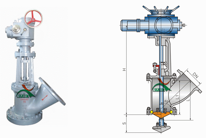 電動(dòng)平底放料閥有Y型及角式兩種結(jié)構(gòu)形式,根據(jù)實(shí)際工況的需要,放料口的形式設(shè)計(jì)有帶管接及平底兩種,閥體內(nèi)腔裝有耐沖刷、耐腐蝕的護(hù)板,在開啟閥門瞬間,可以保護(hù)閥體不被介質(zhì)沖刷、腐蝕,并對(duì)其整體進(jìn)行化學(xué)鍍Ni.P處理,使表面硬度達(dá)到HRC60—62,有耐磨、耐腐蝕的。閥座密封面與閥瓣密封面均堆焊有司太立硬質(zhì)合金,密封副采用線密封,保證密封,密封的可靠性,并可防止結(jié)疤。閥門設(shè)有防轉(zhuǎn)機(jī)構(gòu),保證閥桿在開啟和關(guān)閉時(shí)只做直線運(yùn)動(dòng),不做回轉(zhuǎn)運(yùn)動(dòng)。該閥主要由閥體、閥瓣、密封圈、閥桿、支架、閥壓蓋、手輪、法蘭、螺母、定位螺釘?shù)攘慵M成。手輪順時(shí)針旋轉(zhuǎn),閥門關(guān)閉,閥桿向上移動(dòng),此閥為上展式。手輪順時(shí)針旋轉(zhuǎn),閥門關(guān)閉,閥桿向下轉(zhuǎn)動(dòng),此閥為下展式。閥門驅(qū)動(dòng)方式有:手動(dòng)、電動(dòng)、氣動(dòng)、齒輪傳動(dòng)。