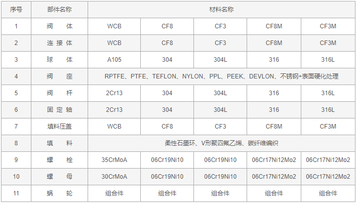 固定式球閥零件材料: