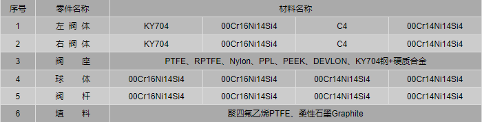 KY704不銹鋼球閥是一種閥體、左閥體、球體、閥桿等主要部件采用KY704或00Cr16Ni14Si4等材料鑄造或鍛造而成的浮動(dòng)球或固定球球閥,該閥所使用的材質(zhì)屬高硅、高鉻鎳奧氏體耐酸不銹鋼,鋼號(hào)00Cr16Ni14Si4,主要適宜在中低溫(≤60℃)濃硝酸(98%HNO3)介質(zhì)中使用,具有優(yōu)良的耐蝕性能(腐蝕速率≤0.1mm/年,在絕對(duì)耐蝕性能標(biāo)準(zhǔn)范圍內(nèi)),同時(shí)又能耐稀硝酸腐蝕,其兼有C2鋼(00Cr17Ni15Si4Nb)和C4鋼(00Cr14Ni14Si4)的某些優(yōu)點(diǎn)。