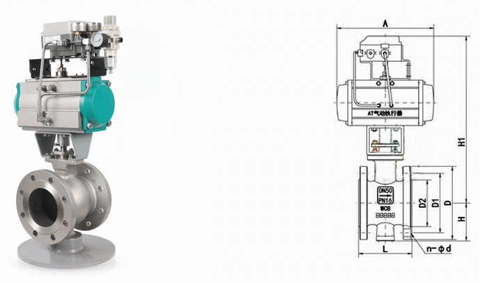 氣動(dòng)V型調(diào)節(jié)球閥由活塞式雙作用或單作用(彈簧復(fù)位式)氣動(dòng)執(zhí)行器和法蘭式V型球閥組成,它與電氣閥門定位器配套使用可實(shí)現(xiàn)比例調(diào)節(jié),與電磁閥及控制箱配套使用可實(shí)現(xiàn)二位切斷控制,該氣動(dòng)V型球閥以壓縮空氣為動(dòng)力,通過活塞齒條、齒輪的機(jī)械傳動(dòng)閥桿,以角行程輸出的扭矩轉(zhuǎn)動(dòng)球體0~90°從而完成啟閉或調(diào)節(jié)動(dòng)作,通過配套電氣閥門定位器輸入4-20mA電流信號(hào)改變閥芯的旋轉(zhuǎn)角度(0-90°任意角度),實(shí)現(xiàn)調(diào)節(jié)控制流量等參數(shù)。氣動(dòng)V型調(diào)節(jié)球閥閥芯設(shè)計(jì)成帶有特殊形狀的V型缺口,具有精確的流量特性和控制功能,主要適用于氣體、液體、固態(tài)顆粒狀等介質(zhì)的控制,尤其是含有纖維性或有微小固體顆粒的懸濁液及固態(tài)顆粒狀的工況場(chǎng)合的自動(dòng)化控制系統(tǒng)。