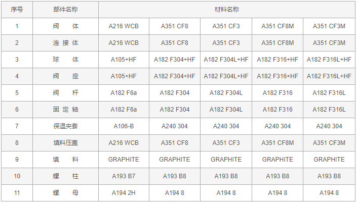 美標(biāo)保溫球閥零件材料: