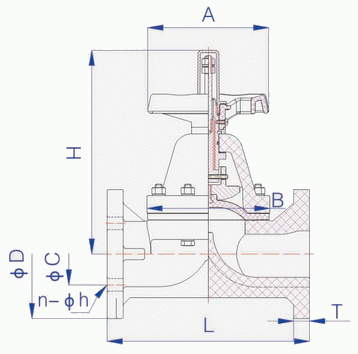 G41F-16S法蘭式塑料隔膜閥外形結(jié)構(gòu)圖: