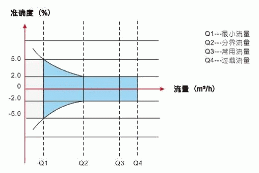 Q3/Q1 | Q2/Q1 | 最小流量Q1(m3/h) | 分界流量Q2(m3/h) | 常用流量Q3(m3/h) | 過(guò)載流量Q4(m3/h) |