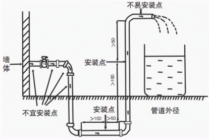 (2)安裝位置不要選在管道走向的最高點(diǎn),防止管道內(nèi)因有氣泡聚集而造成測量不正常。
