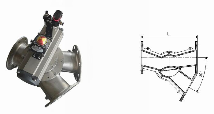 三通換向閥主要以壓縮空氣作為動力源,通過雙作用氣動執(zhí)行器帶動帶柄的柱塞在設計成Y形三通道(即中間一個進口和左右兩端兩個出口)閥體內作120°或135°角行程往復運動,實現(xiàn)對送料系統(tǒng)管道內介質的自動換向,即當氣缸旋轉120°或135°帶動閥芯關閉左端的出料口時,右端的出料口開通,當氣缸回轉120°或135°帶動閥芯關閉右端的出料口時,左端的出料口開通,從而使閥門的流向切換達到了自動化控制。該閥氣動執(zhí)行器通常與電磁閥和限位開關及空氣過濾減壓閥等附件配合使用,其電磁閥線圈電壓等級一般采用24V(DC)或220V(AC)等,并有防爆與非防爆之分。